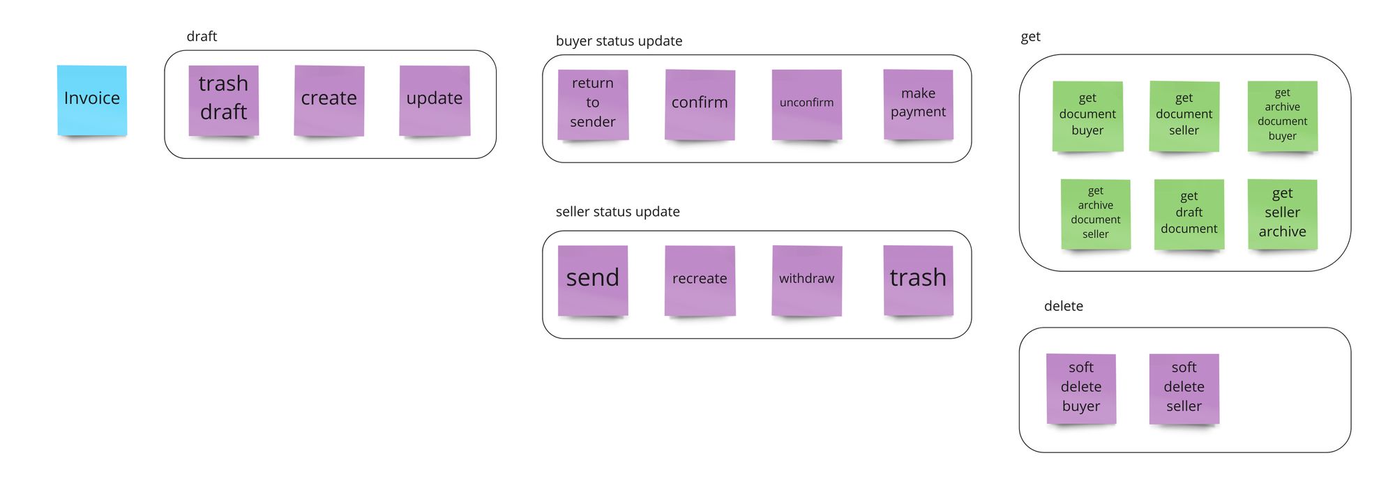 With invoices, it's harder to jump right into modules as we have a lot of end-points. The first step is to look at these and sort them out. Effectively we have five categories.
