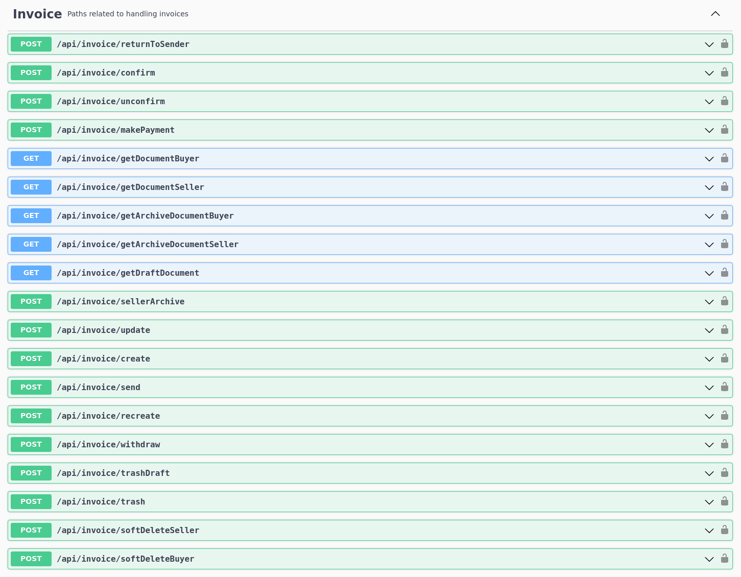 There are two actions that can be taken from the "draft" state. Either the invoice can be moved to the trash, or sent. These can be done with PATCH /api/invoice to update the status of the invoice with a new action. In the case the invoice is "sent", the invoice is signed and sent to the buyer. From that point the contents of the invoice cannot be changed, and the status of the invoice must be negotiated between the two parties.