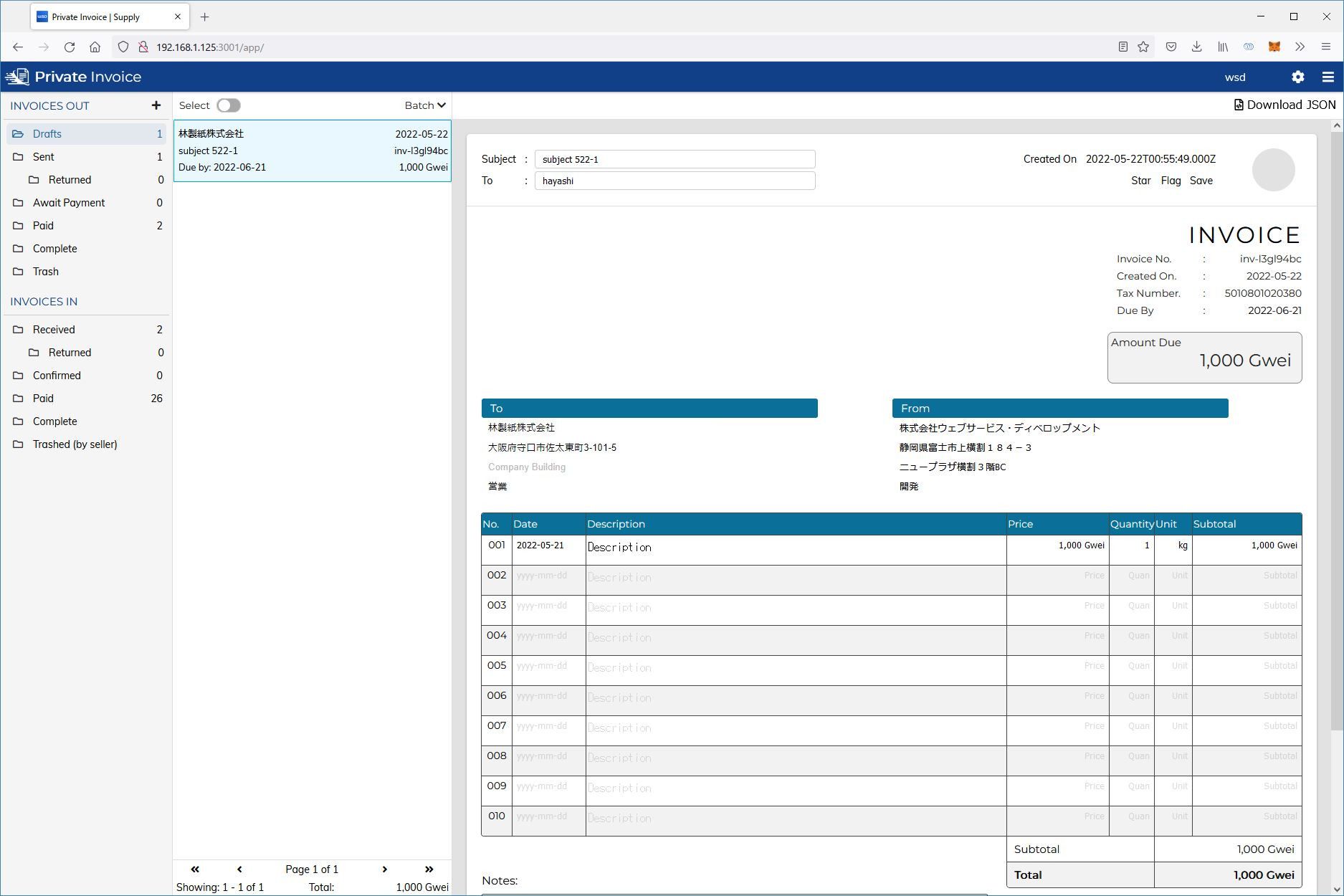 The first thing that the user does is decide on a subject, and enter a contact to send to the user. In this case we are using the wsd user which is using the 192.168.1.125:3001 instance. We are sending the invoice to a hayashi user using a 192.168.1.125:3000 instance.