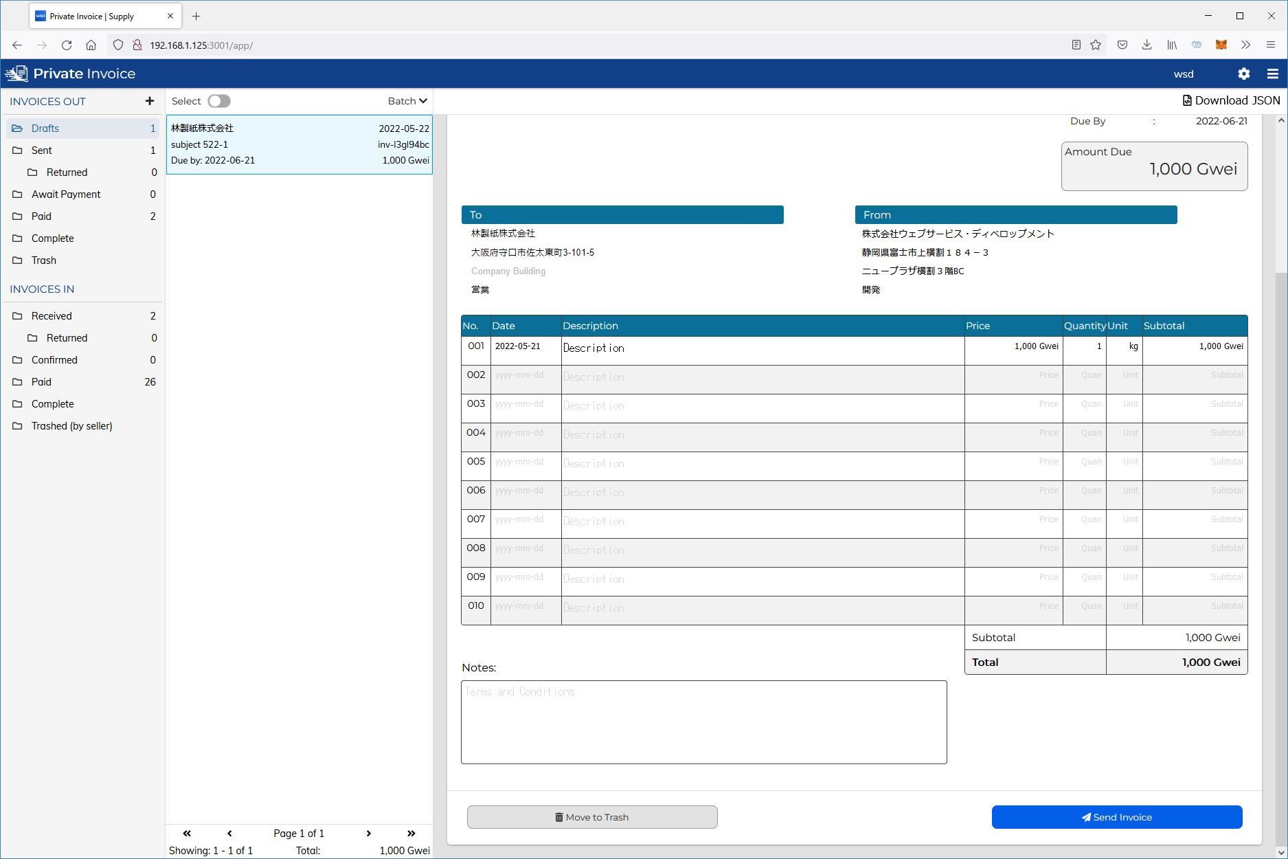 The first option being Move to Trash, similar to mail where a draft is trashed without being sent. and Send Invoice. Once Send Invoice is clicked, right now this function exists over a standard web API. Our instance at 192.168.1.125:3001 sends an http request to 192.168.1.125:3000 with the contents of our invoice as JSON. The other instance will check to see if wsd from 192.168.1.125:3001 is in hayashi from 192.168.1.125:3000 list of contacts.